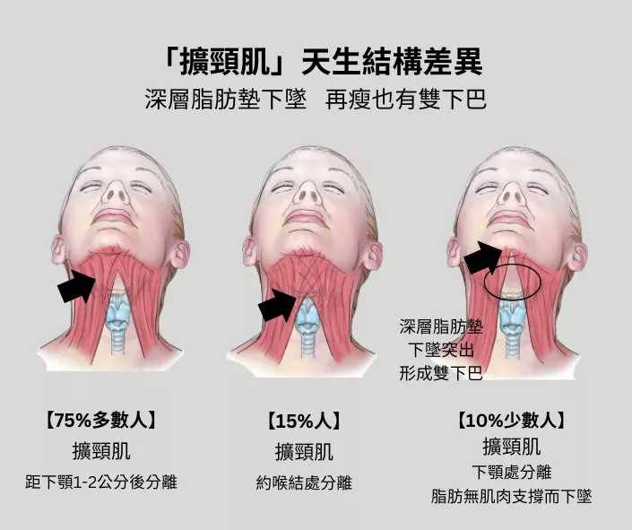 擴頸肌因天生結構影響,肌肉從下顎處即分離(多數人在離下顎處1~2公分後才開始分離),造成深層脂肪墊沒有肌肉支撐而往下墜,人即使再瘦也會出現下巴肉。