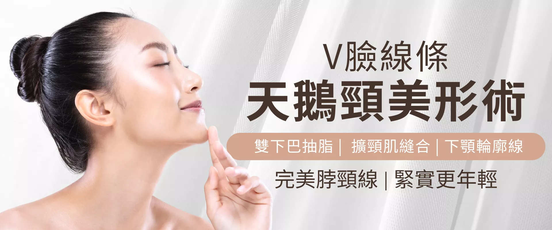 天鵝頸美形術(Platysmaplasty & Neck Lift Surgery):主要是針對下半臉至脖頸之間的區域進行全面改善,其中包含「雙下巴」、「火雞脖」、「輪廓線鬆弛」、「擴頸肌鬆弛」等綜合式問題來進行全面改善,藉由威塑抽脂來抽取脂肪、縫合擴頸肌、超能電漿縮皮的方式,來打造完美的年輕下半臉肩頸線條。